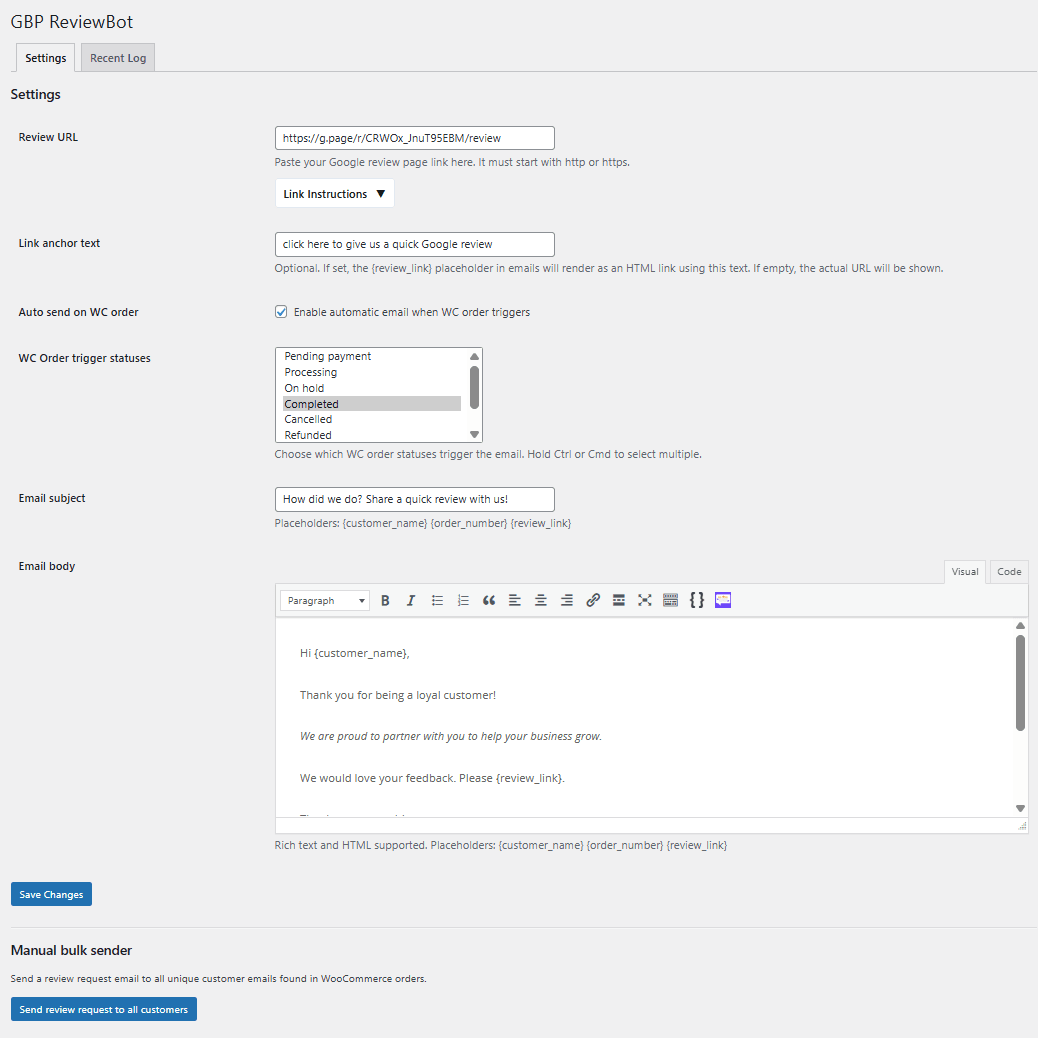 GBP ReviewBot is a must-have utility for WooCommerce stores that want more Google reviews with less work. This lightweight plugin sends friendly review request emails after orders reach the status you choose, and it can also send manual requests in bulk to past customers. It tracks when a customer clicks the review link, stops any further follow ups for that order, and keeps a simple Recent Log so you always know what went out. Set it once and let it run while you focus on sales.